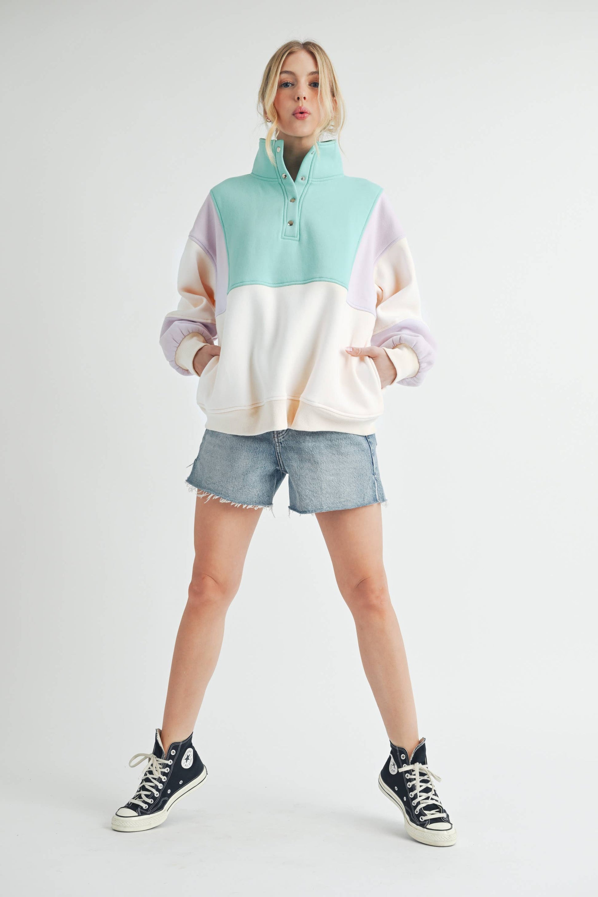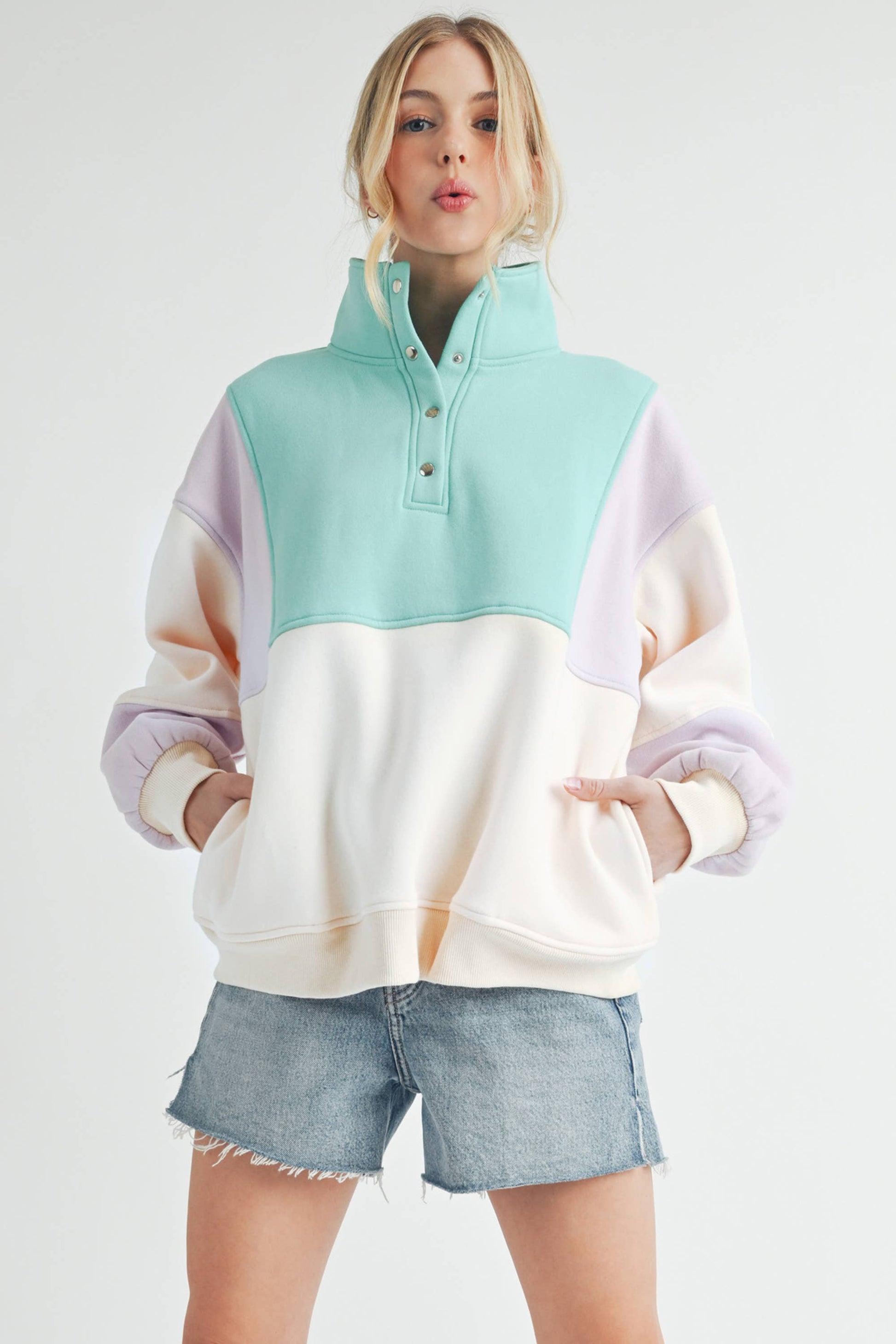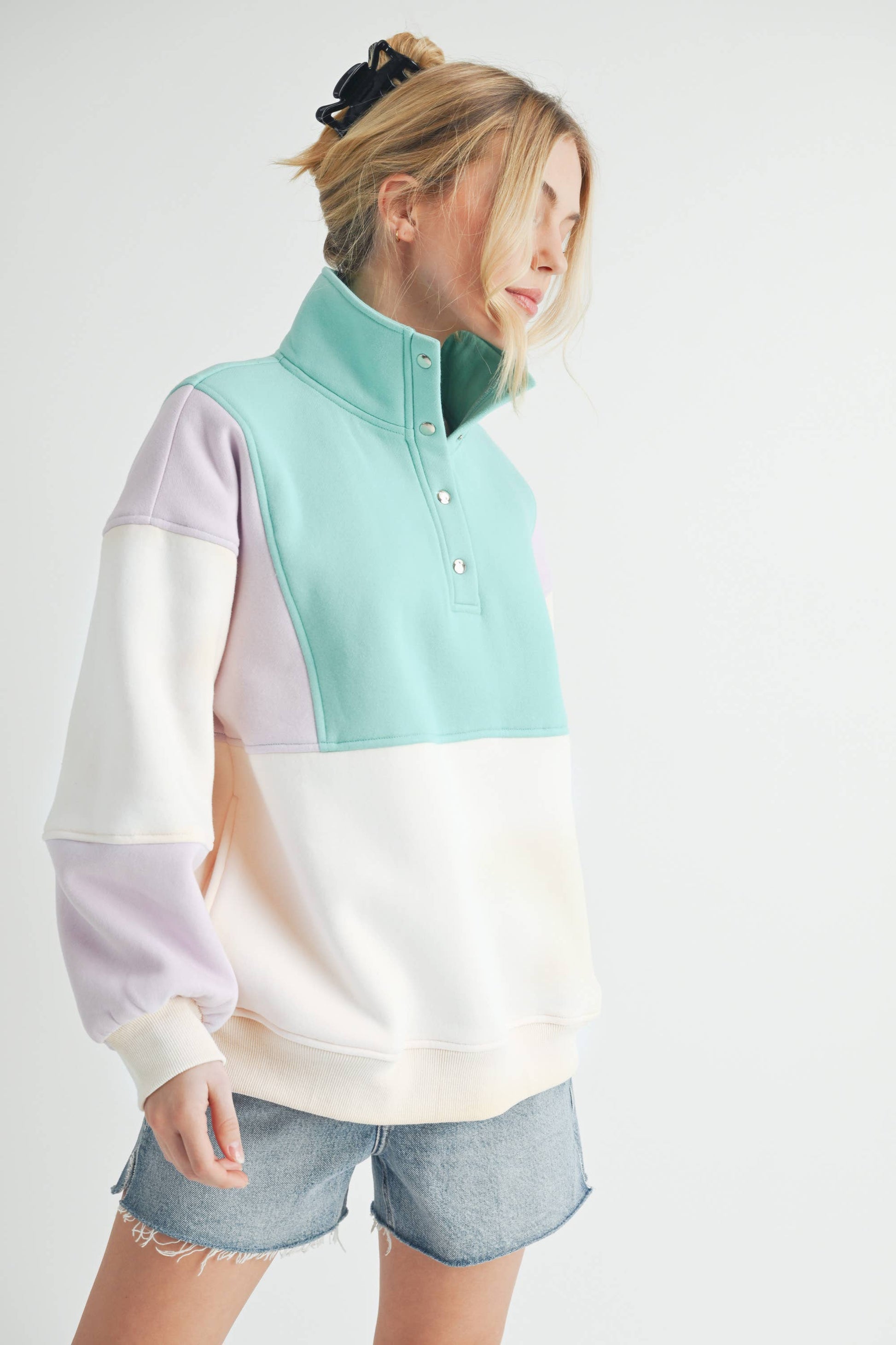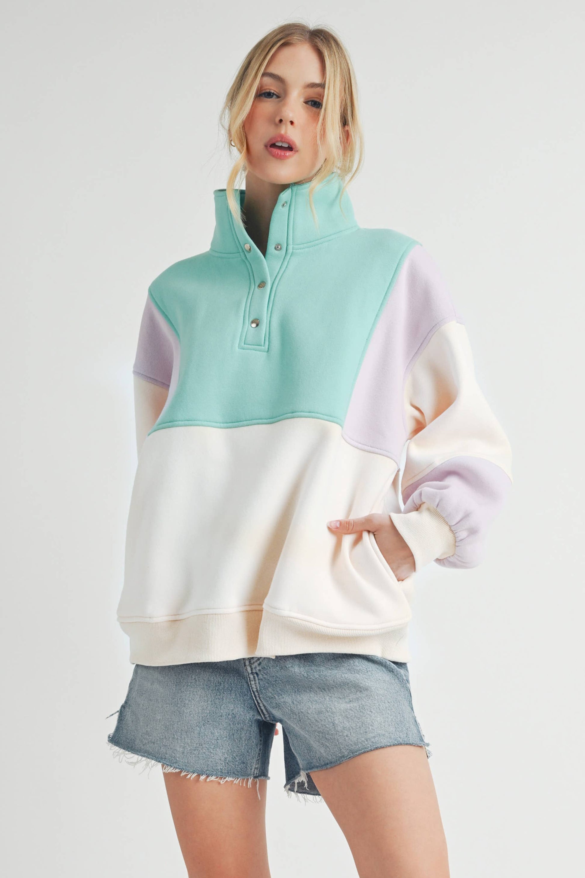 Introducing our chic Glo colorblock pullover, featuring stylish snap buttons for easy wear. This versatile piece combines comfort and modern design, making it a perfect addition to any wardrobe.