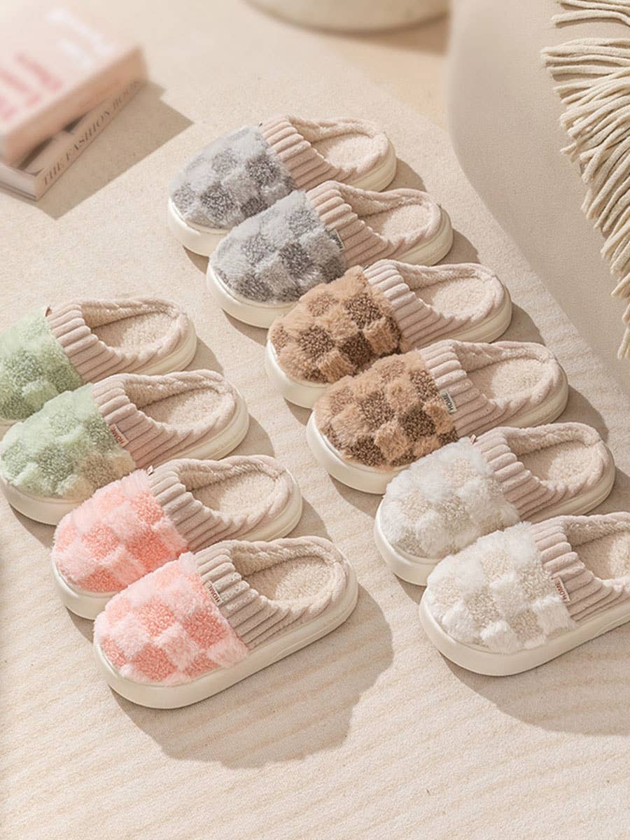 Checkered Fuzzy Warmies Slippers: COFFEE