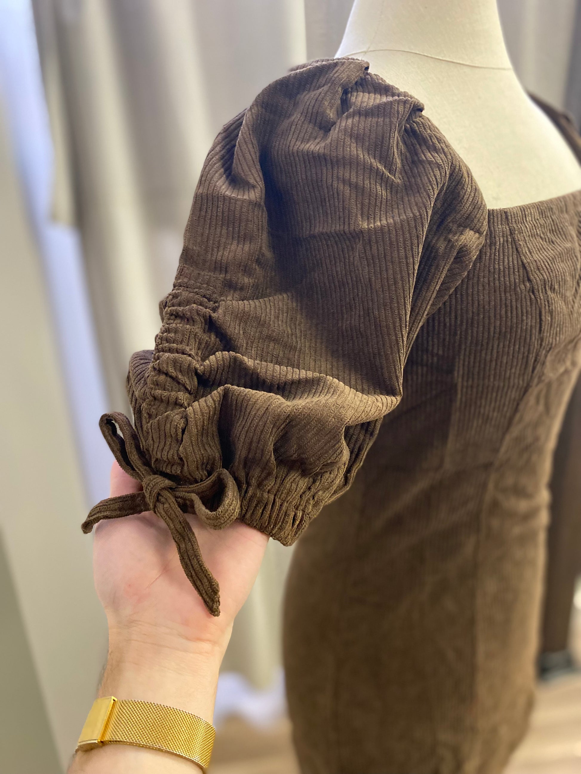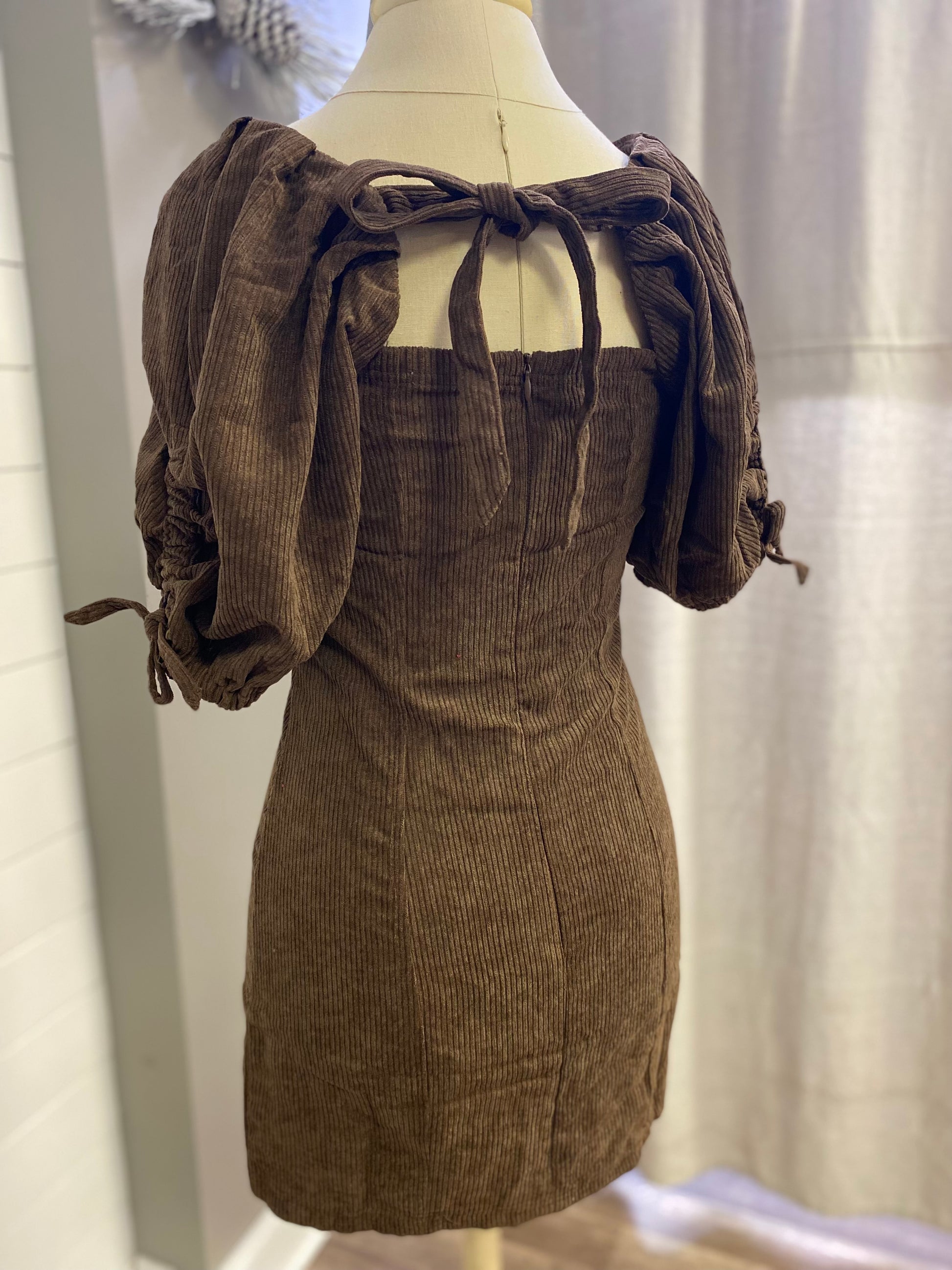 Corduroy Square Neck Puff Sleeve Mini Dress With Ties