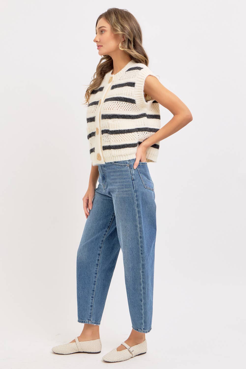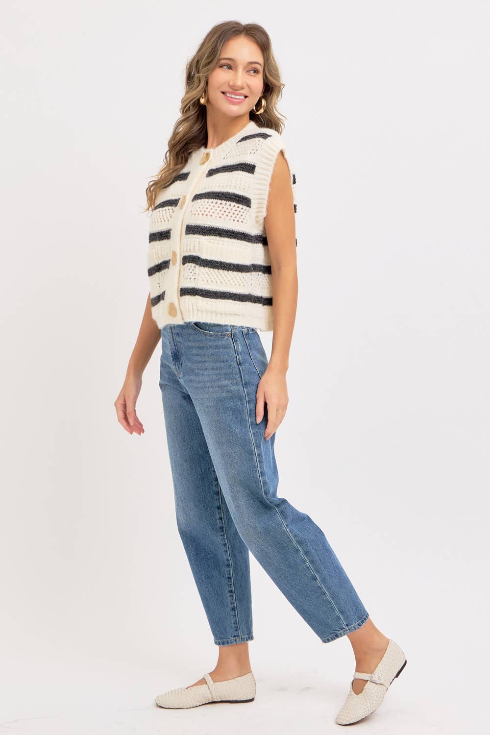 STRIPE BUTTON CLOSURE SWEATER KNIT SLEEVELESS TOP. FRONT PATCH OOCKETS WITH FRONT GOLD BUTTON CLOSURE. BOXY SILHOUETTE. GOOD TRASITION PIECE. PERFECT FOR LAYERING. MADE WITH SOFT SWEATER KNIT FABRICATION.